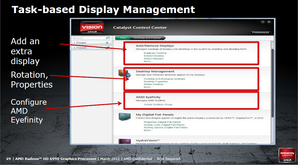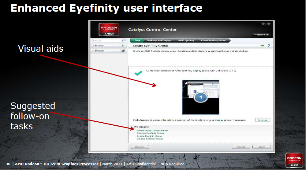 Di seguito vi mostriamo la preview dei nuovi display driver che a partire della release 11.4 nel Catalyst Control Center porteranno alcune modifiche al sistema di gestione Eyefinity che sarà più facilmente configurabile e gestibile:
